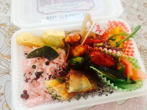 お赤飯・春巻き2種類・鶏胸肉のマヨネーズ風味揚げ・お花型卵焼・豚肉のポテト巻・さつまいもサラダ・洋風きんぴら